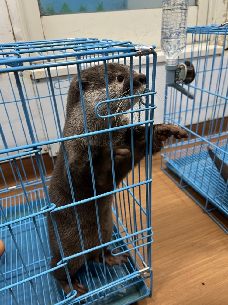 ゲージに入ってお利口さんのカワウソちゃんに餌をあげるよ!それだけが触れ合いの時間かな?