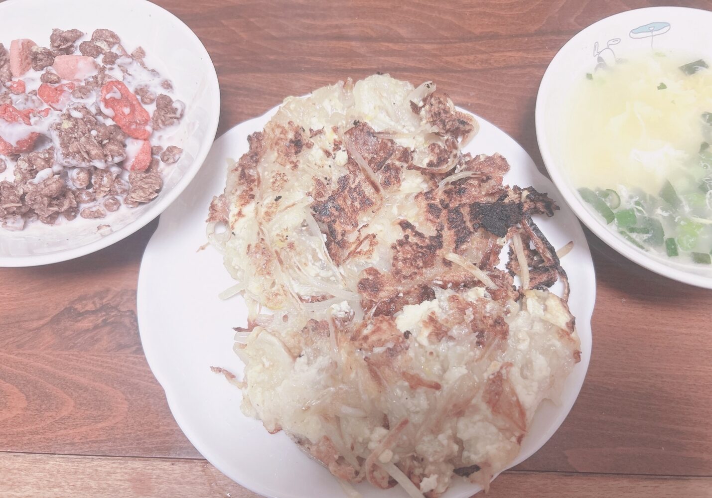 今日作ったダイエット飯です!!もやしと豆腐のガレットと、卵ネギスープとグラノーラヨーグルトです!!